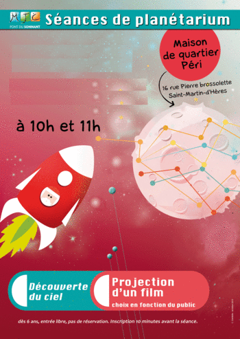 Séances à 10h et 11h. La MJC est équipée d’un planétarium gonflable. Des séances sont organisées sur place à la Maison de Quartier Péri, mais le planétarium peut se déplacer dans les écoles, MJC, collèges… Si vous souhaitez accueillir le planétarium dans votre structure, contactez-nous.
