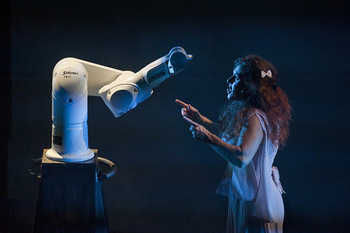 Accompagnée par une machine industrielle, la comédienne met en évidence les paradoxes et les fonctionnements contraires, explore le rôle du langage, de ses possibles poétiques et de son éventuelle efficacité pour communiquer avec son Autre. Elle crée du lien, émeut, émet une distance et questionne le rapport entre l'humain et le robot.