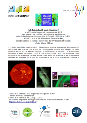 La MJC Pont-du-Sonnant et le Club astronomie G-INP vous invitent à une conférence scientifique de Jean Lilensten (IPAG-UGA, CNRS) dans le cadre de la Semaine européenne du développement durable à Saint-Martin d'Hères.