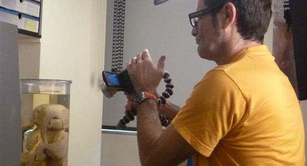Laurent Mulot prépare la "chambre d'écho" qui s'installera dans l'Orangerie du Muséum en octobre... Il filme ici une collection humide du...